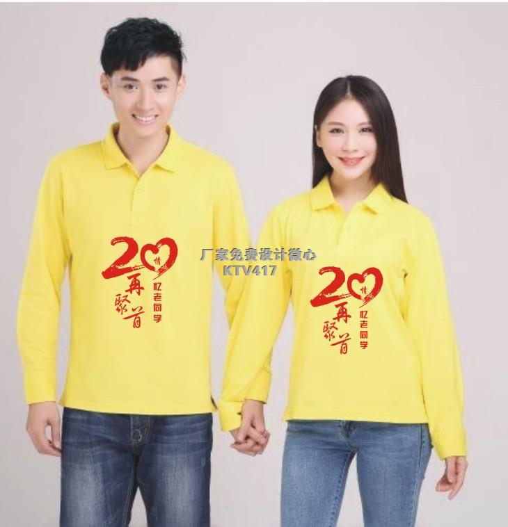常用的聚会服装款式为长袖翻领T恤衫和长袖圆领T恤衫。长袖翻领T恤衫印字设计理念为“小而精致”,因为翻领的T恤衫一般为中高端衣服,如果在正胸印刷大面积的图案,只能聚会当时穿穿,过了那天,再穿有个大图案在胸口,不合适。国人依“勤俭节约”为佳话,好衣服就穿那一天,从心里上总感觉有点浪费。按照多数同学们的购买期望,买一个不错的长袖翻领T恤衫,在胸口印刷小一点的印字,聚会过后还能继续穿,还是一件衣服。从这个设计理念出发,翻领T恤衫一般都是在左胸印刷印字和图案。根据聚会t恤衫颜色,设计出相应的印字。按照大多数班级选择的T恤衫颜色,红色和白色T恤衫居多。红色的翻领聚会t恤衫印刷黄色的图案或者白色的印字,白色的聚会翻领聚会t恤衫印刷红色的LOGO或者黑色的图案。