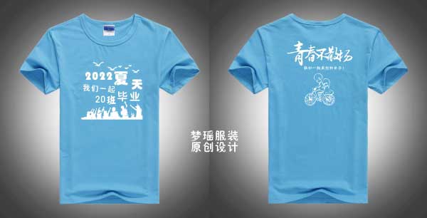 这款班服图案采用的是湖蓝色底衫,图案采用的是白色20班图案,视觉清新,图案典雅。